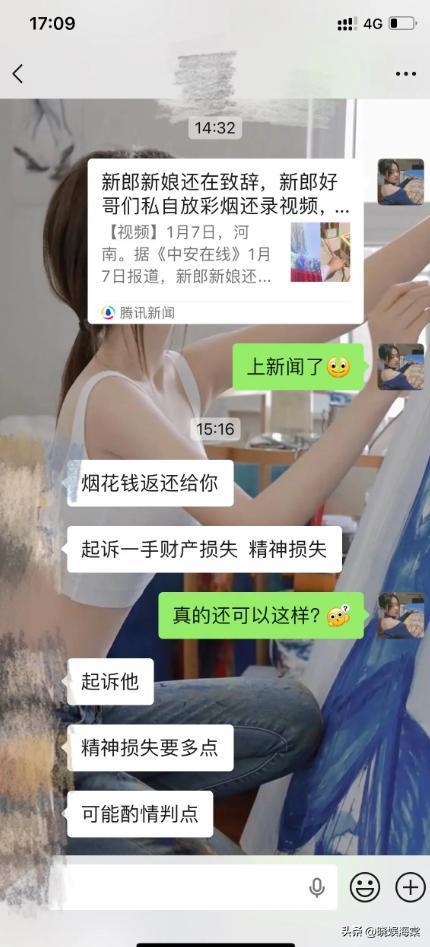 1月11日,新娘发长文为新郎辩解,新郎已经没有打算去他的婚礼了,甚至还表示会把礼钱退给伴郎,以后也不会再往来了,只要伴郎将烟花钱还给自己。